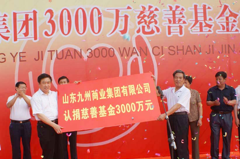 6月5日,臨沂市慈善總會(huì )為集團舉行了“山東九州商業(yè)集團3000萬(wàn)慈善基金捐贈儀式”。臨沂市慈善總會(huì )會(huì )長(cháng)、市政府副市長(cháng)左沛廷,慈善總會(huì )常務(wù)副會(huì )長(cháng)、民政局長(cháng)姜新利,慈善總會(huì )副會(huì )長(cháng)、集團董事長(cháng)楊本渠,慈善總會(huì )副會(huì )長(cháng)兼秘書(shū)長(cháng)、民政局副局長(cháng)朱步君,以及集團領(lǐng)導副董事長(cháng)兼黨委書(shū)記張素芬、總經(jīng)理楊沂城、黨委副書(shū)記王佐文等出席捐贈儀式。 此次認捐3000萬(wàn)元慈善基金,是集團在去年向市慈善總會(huì )認捐200萬(wàn)元,設立“九州慈善基金”的基礎上追加的。隨著(zhù)追加額度的增加,救助范圍也逐步的擴大,從去年的用于助學(xué)擴大到走訪(fǎng)困難群眾和其它全市慈善救助項目。多年來(lái),集團在自身不斷發(fā)展壯大的同時(shí),牢記報效國家、回饋社會(huì )、投身公益的使命,積極參與各類(lèi)助學(xué)、助殘、救災、濟困等公益活動(dòng)。集團累計捐款捐物達數百萬(wàn)元,尤其去年四川大地震后,集團全體干部職工心系災區,捐款捐物100余萬(wàn)元,受到社會(huì )各界的一致好評。今年5月9日集團被評為臨沂市首屆“十大慈善單位”。九州人用大愛(ài)譜寫(xiě)了一曲曲獻身慈善事業(yè)的壯美樂(lè )章。 慈善事業(yè)是一項崇高而光榮的事業(yè),開(kāi)展慈善捐助、幫助弱勢群體,對促進(jìn)社會(huì )進(jìn)步,構建和諧社會(huì )具有重要而深遠的意義。隨著(zhù)企業(yè)的發(fā)展,集團將進(jìn)一步投入到慈善事業(yè)中去,為推動(dòng)我市慈善事業(yè)的發(fā)展和構建和諧社會(huì )貢獻自己的一份力量。