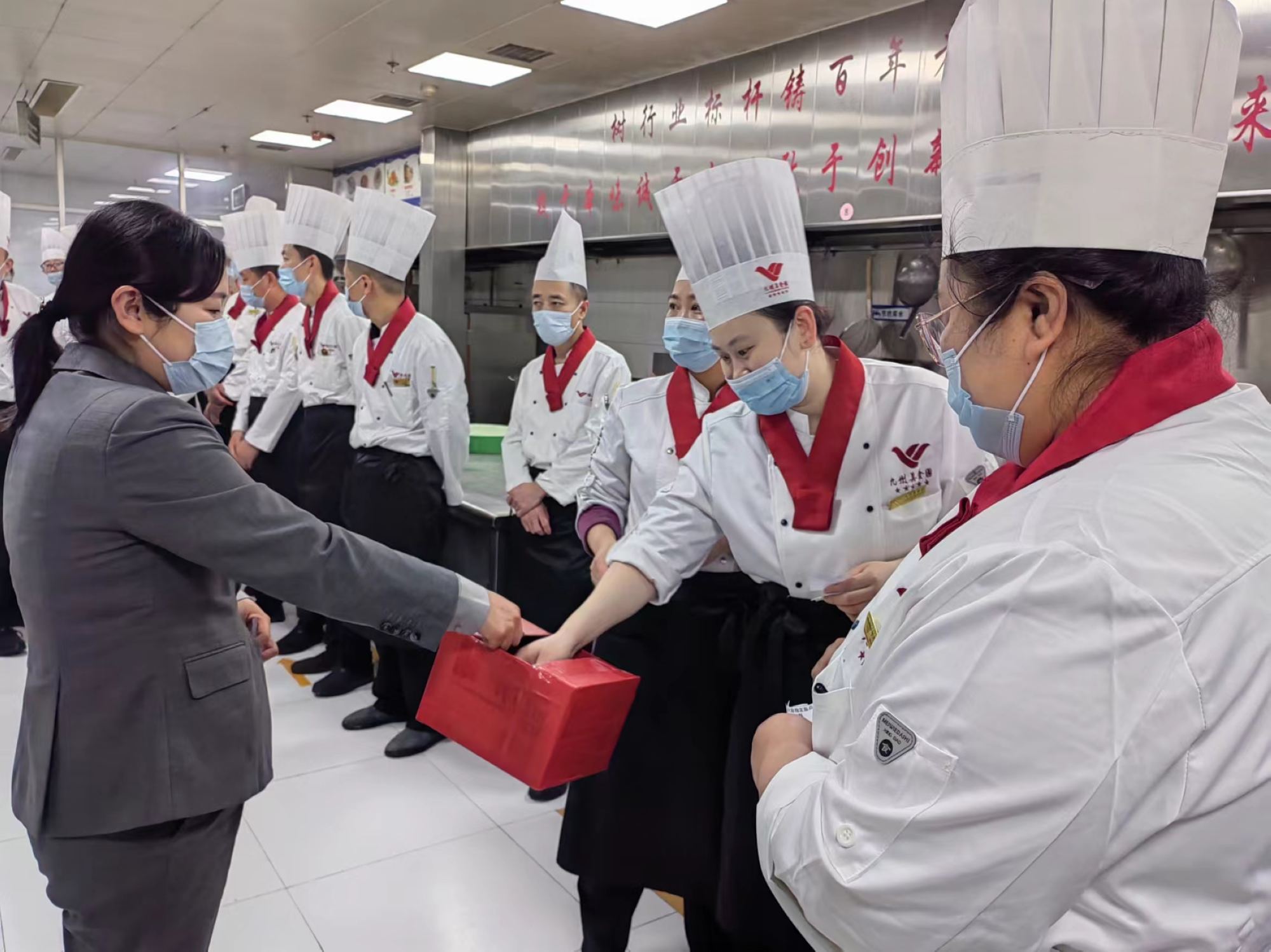 大廚崗位復評考核每?jì)赡昱e辦一次,考核內容分為現場(chǎng)操作和技能操作兩部分,F場(chǎng)操作主要考察儀容儀表、操作衛生、合理用料及考場(chǎng)紀律等方面;技能操作主要考察大廚的基本功及菜品創(chuàng )新能力,同時(shí)要求所做菜品、面點(diǎn)適用門(mén)店經(jīng)營(yíng)所需。復評過(guò)程中,大廚需在規定時(shí)間內現場(chǎng)制作指定菜品或面點(diǎn)一道,指定原料一道,自選菜品一道。