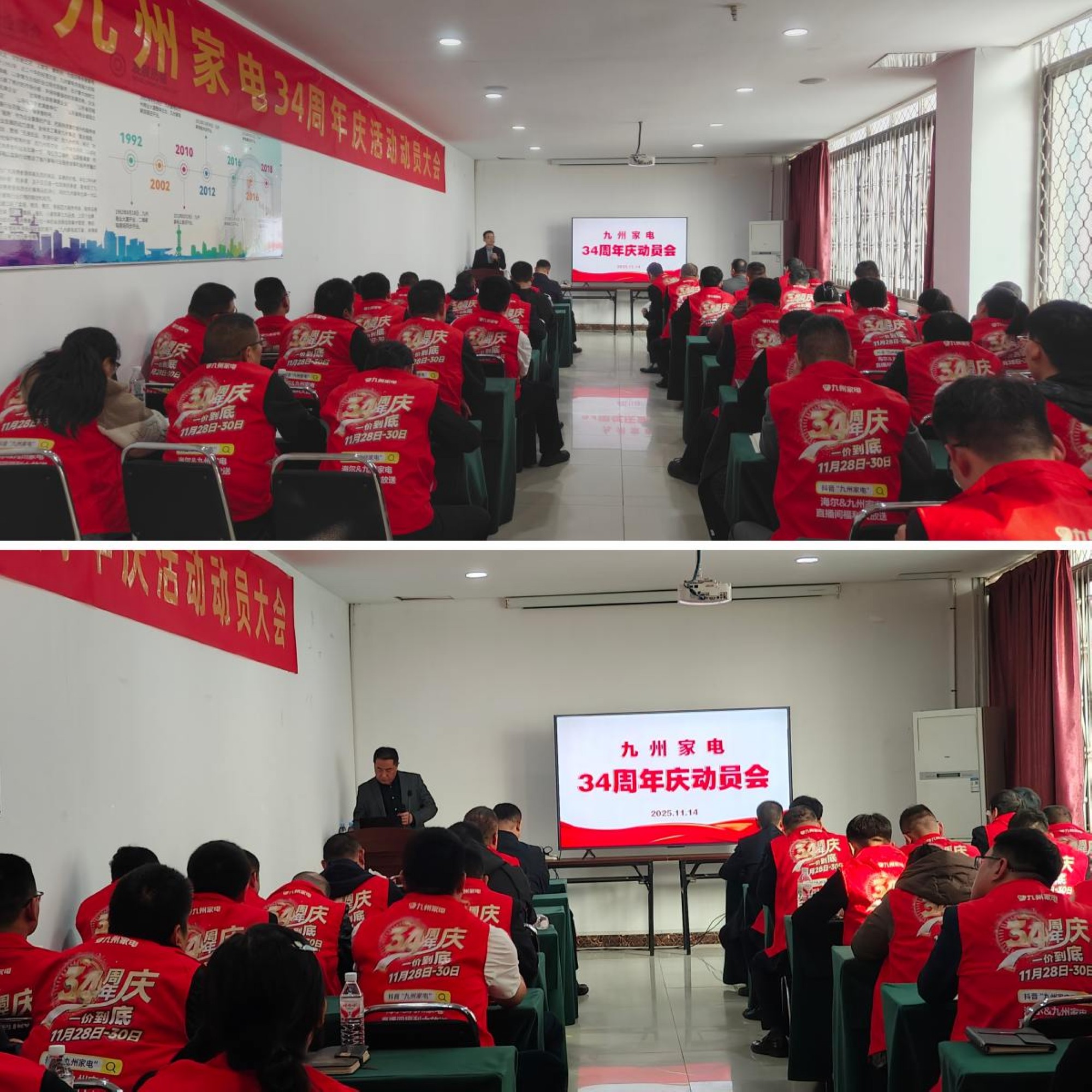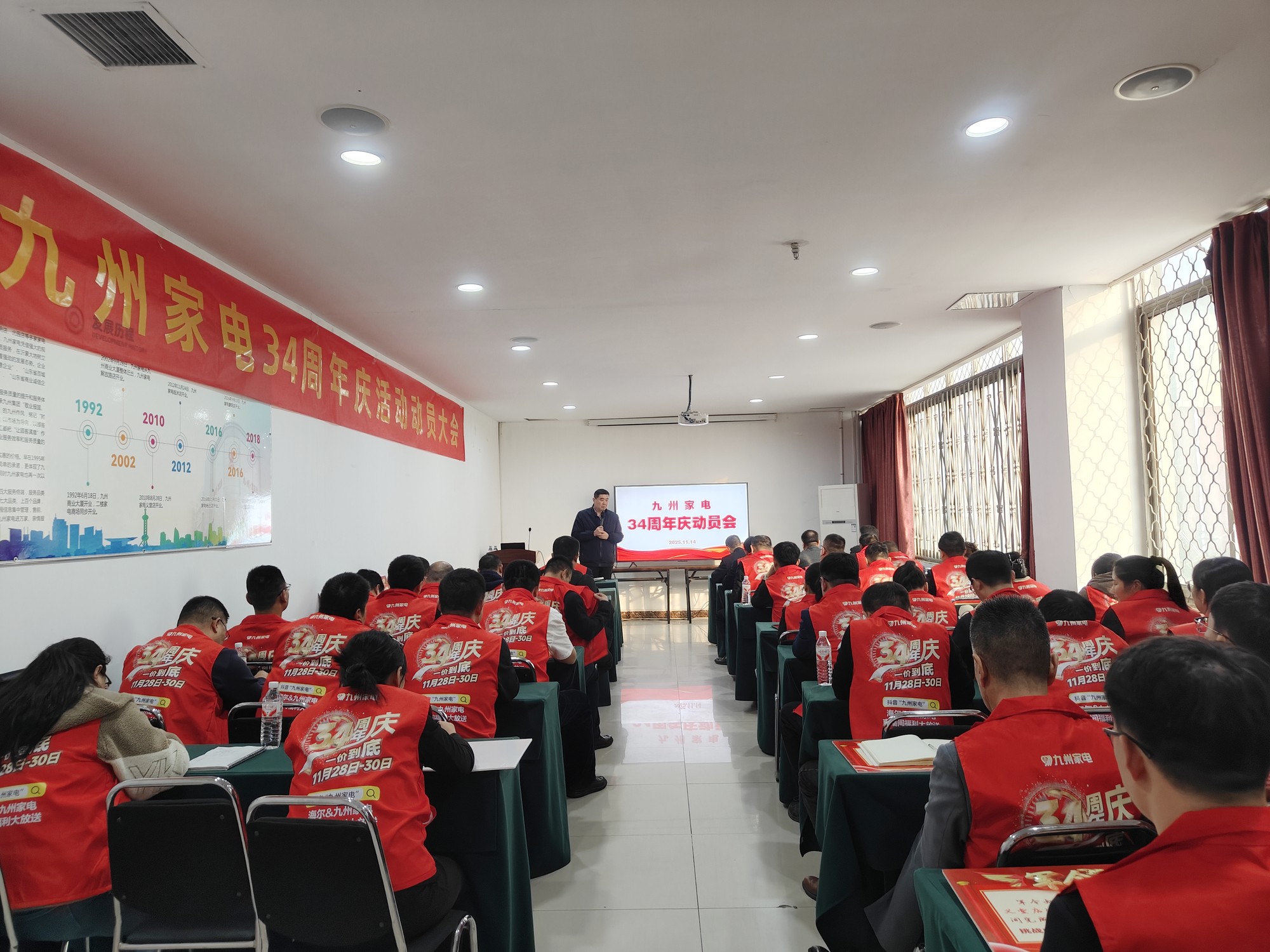 11月14日下午,九州家電34周年慶動(dòng)員會(huì )在解放路店二樓會(huì )議室召開(kāi)。九州家電主管及以上管理人員共50余人參加了會(huì )議。