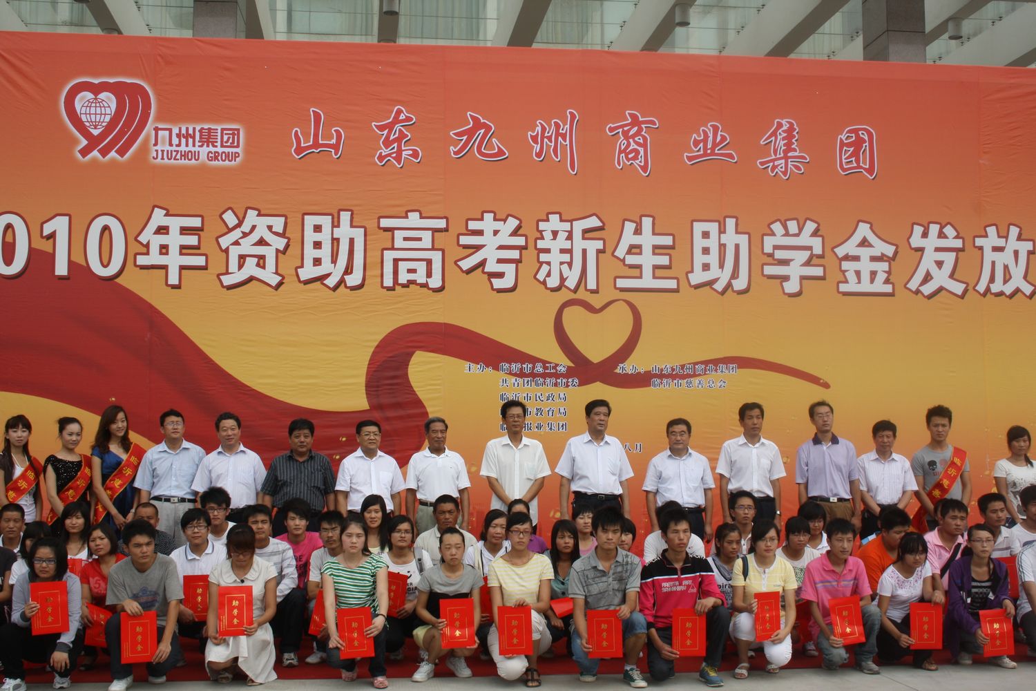 8月31日上午,山東九州商業(yè)集團2010年資助高考新生助學(xué)金發(fā)放儀式在臨沂賓館商城店舉行。儀式上,66名品學(xué)兼優(yōu)的特困新生每人獲得了4000元的助學(xué)金。市人大常委會(huì )副主任、市慈善總會(huì )名譽(yù)會(huì )長(cháng)李寶智,市政府副秘書(shū)長(cháng)、市慈善總會(huì )副會(huì )長(cháng)張凡春,市紀委派駐五組書(shū)記王言卓,市民政局副局長(cháng)、市慈善總會(huì )副會(huì )長(cháng)朱步君,市總工會(huì )副主席陳愛(ài)平,共青團臨沂市委副書(shū)記俞陽(yáng),市慈善總會(huì )副會(huì )長(cháng)、原集團董事長(cháng)楊本渠,集團董事長(cháng)楊沂城,集團黨委書(shū)記王佐文,市慈善總會(huì )辦公室主任李長(cháng)征,市教育局學(xué)生資助中心主任陳磊等出席發(fā)放儀式。 這是集團連續三年向高考特困新生發(fā)放助學(xué)金。三年來(lái),集團幫助近百名高考新生順利走進(jìn)了大學(xué)校門(mén),在學(xué)校里許多受資助的學(xué)生紛紛來(lái)信表達感激之情。集團積極投身慈善事業(yè),勇于承擔社會(huì )責任,得到了上級領(lǐng)導和社會(huì )各界的一致好評,被授予“臨沂市十大愛(ài)心企業(yè)”、“臨沂市首屆十大慈善單位”等榮譽(yù)稱(chēng)號。