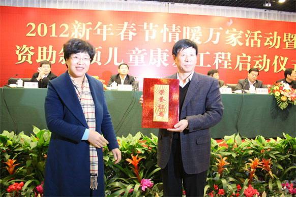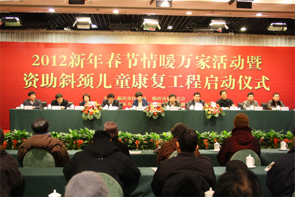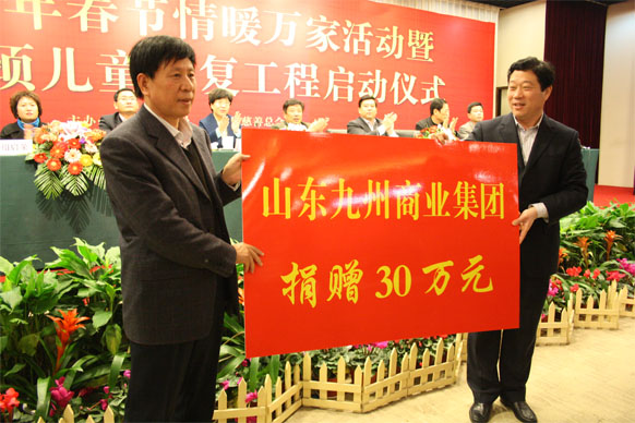 12月10日,2012年臨沂市新年春節情暖萬(wàn)家活動(dòng)啟動(dòng)儀式在臨沂賓館舉行,活動(dòng)現場(chǎng)同時(shí)舉行了斜頸兒童康復工程啟動(dòng)儀式,并為困難家庭發(fā)放了資助金。市政協(xié)副主席趙愛(ài)華,市直有關(guān)部門(mén)領(lǐng)導出席啟動(dòng)儀式。 活動(dòng)現場(chǎng),九州集團向臨沂市慈善總會(huì )捐款30萬(wàn)元,用于資助困難家庭。集團黨委書(shū)記王佐文出席啟動(dòng)儀式并代表集團進(jìn)行了現場(chǎng)捐贈。