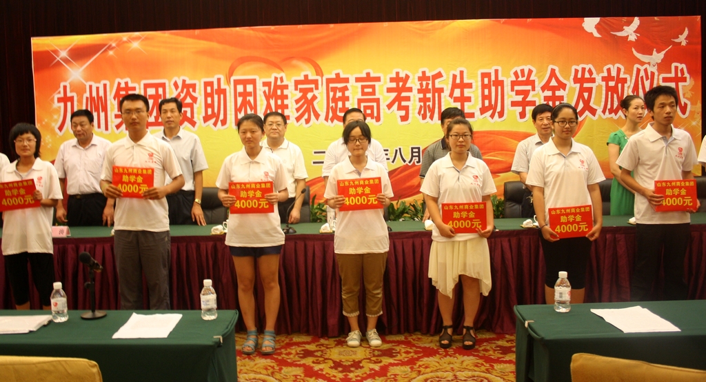 受助學(xué)生 8月15日,九州集團2013年度資助困難家庭高考新生助學(xué)金發(fā)放儀式在臨沂賓館大學(xué)酒店舉行。張聞?dòng)、張佃余等市領(lǐng)導,楊沂城、王佐文等集團領(lǐng)導出席九州助學(xué)金發(fā)放儀式,F場(chǎng)100名優(yōu)秀困難高考新生總計獲得40萬(wàn)助學(xué)金。 市政府黨組成員、市高新技術(shù)開(kāi)發(fā)區管委會(huì )主任、市慈善總會(huì )會(huì )長(cháng)張聞?dòng)钤谥鷮W(xué)金儀式上講話(huà),對我集團急困難學(xué)生之所急,伸出友愛(ài)之手,連續多年救助困難家庭學(xué)生給予肯定,對我集團積極參與公益事業(yè),支持我市慈善事業(yè)發(fā)展表示感謝。 集團董事長(cháng)楊沂城在致辭中,代表集團對在今年高考中取得優(yōu)異成績(jì)的同學(xué)們表示祝賀。對受助同學(xué)們身處逆境、自強不息、追求夢(mèng)想的拼搏精神,刻苦學(xué)習、立志成才、不畏困難的吃苦精神給予了充分肯定,勉勵受助的同學(xué)們珍惜寶貴的學(xué)習機會(huì ),豐富知識、堅定信念、砥礪品格、磨練意志,努力成為社會(huì )有用之人、祖國棟梁之材。 受助學(xué)生代表在助學(xué)金發(fā)放儀式上發(fā)言,他們對我集團的大愛(ài)之心、大善之舉,表達了由衷的感謝,紛紛表示進(jìn)入大學(xué)努力學(xué)習,回報社會(huì ),永遠不會(huì )忘記九州集團的幫助。 九州助學(xué)金截至今年已發(fā)放六屆,六年來(lái)發(fā)放助學(xué)金200余萬(wàn)元,資助優(yōu)秀高考新生600余名。“圓夢(mèng)沂蒙”已成為我市著(zhù)名的慈善助學(xué)品牌,榮獲“山東慈善獎最具影響力慈善項目”。 多年來(lái),集團在事業(yè)發(fā)展的同時(shí),始終秉承“敬業(yè)報國 奉獻社會(huì )”的經(jīng)營(yíng)理念,積極投身慈善事業(yè),勇于承擔社會(huì )責任。近年來(lái),在臨沂市慈善總會(huì )的大力支持下,先后組織實(shí)施了“情暖萬(wàn)家”、“朝陽(yáng)助學(xué)”、“夕陽(yáng)扶老”、“康復助醫”和“愛(ài)心助殘”等救助工程,累計為慈善事業(yè)捐款捐物近千萬(wàn)元,為我市慈善事業(yè)的發(fā)展作出了應有貢獻。