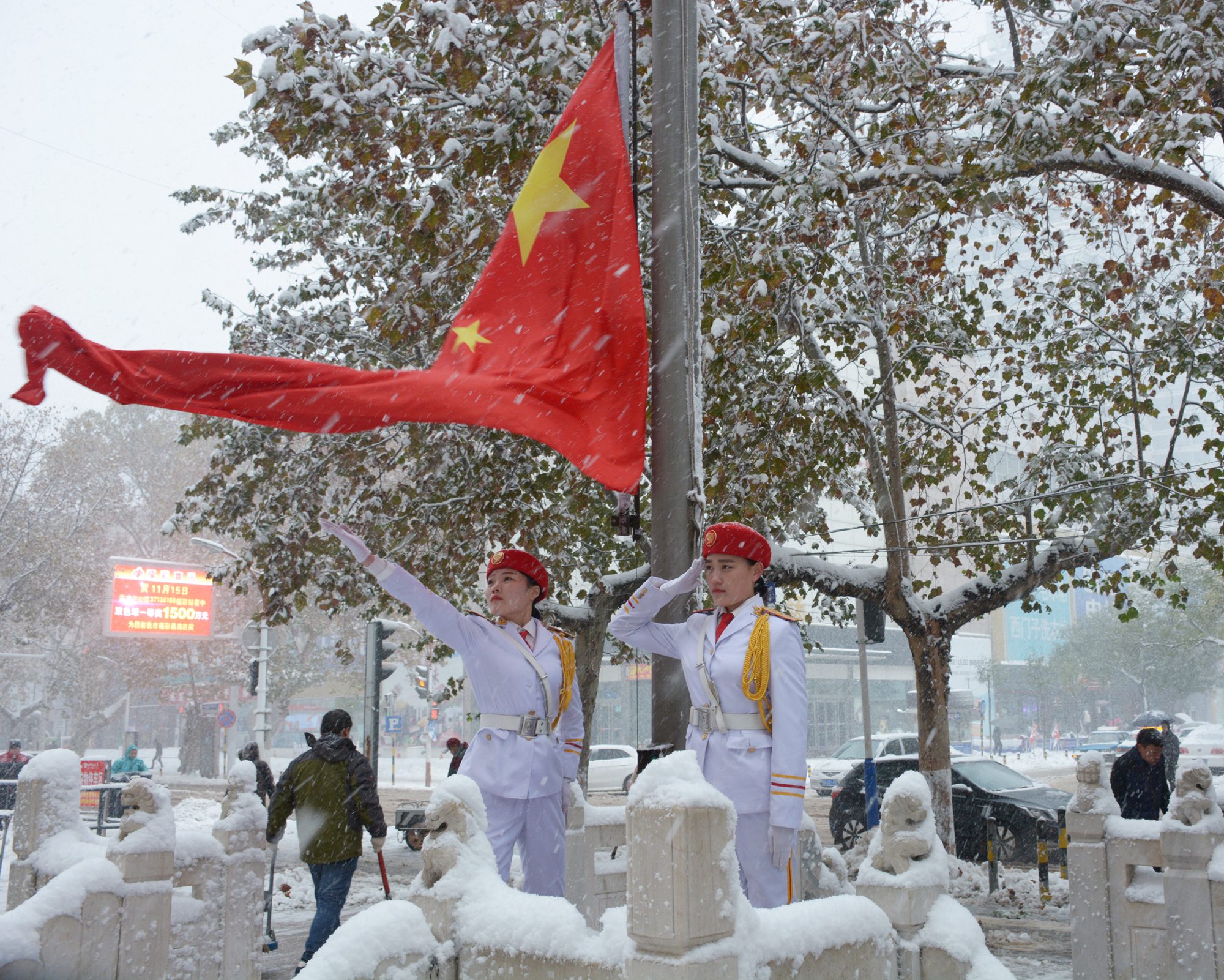 一等獎(jiǎng)《雪中升旗儀式》 攝影:田鋒(九州商業(yè)大廈)