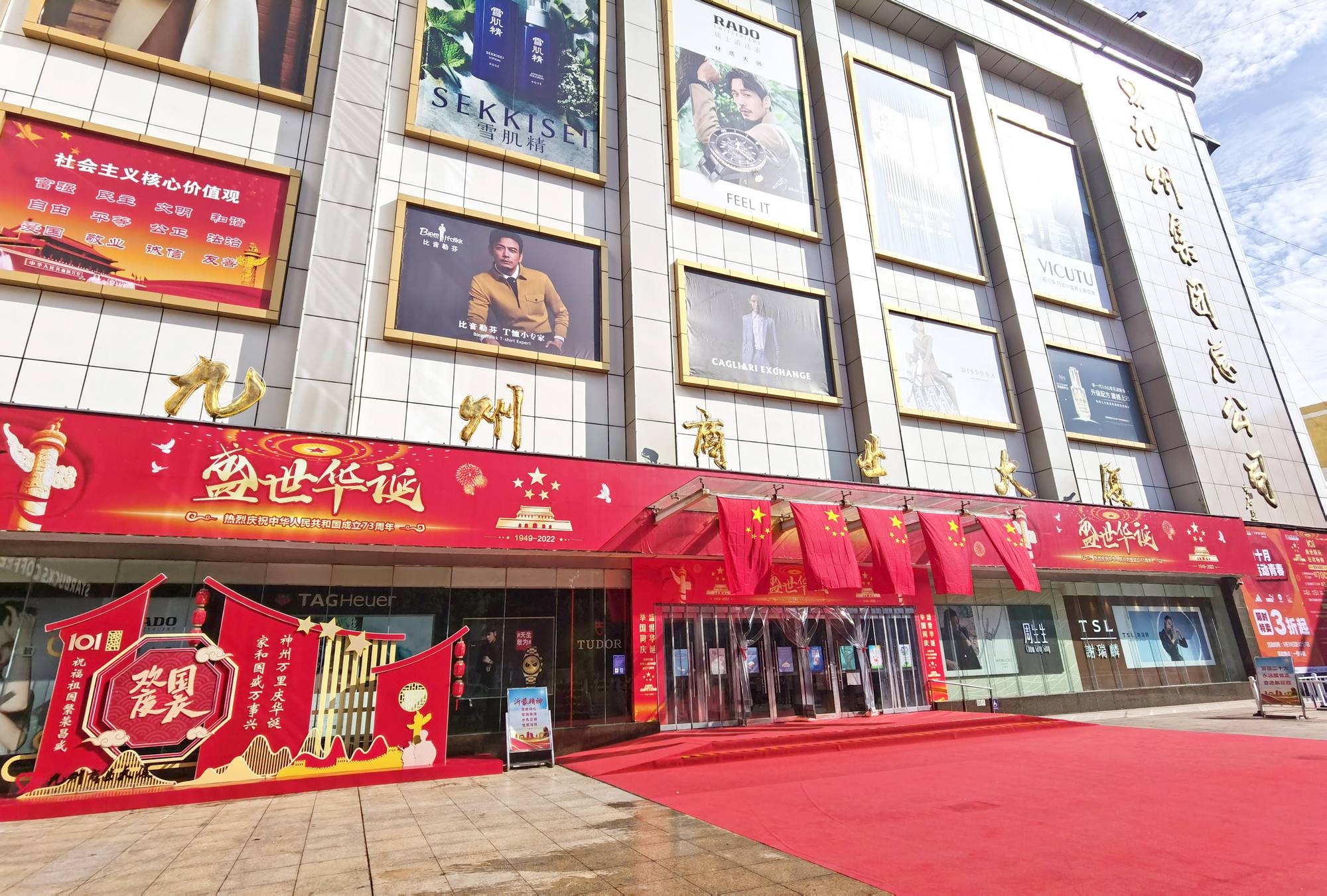 和煦的陽(yáng)光將門前廣場(chǎng)上的紅色地毯描上了一層金邊,“歡度國(guó)慶”大型宣傳欄與“盛世華誕”宣傳畫交相輝映,全場(chǎng)彌漫著歡樂祥和的氛圍。百余名群眾自發(fā)來(lái)到九州商業(yè)大廈解放路店門前廣場(chǎng),見證五星紅旗冉冉升起的莊嚴(yán)時(shí)刻。