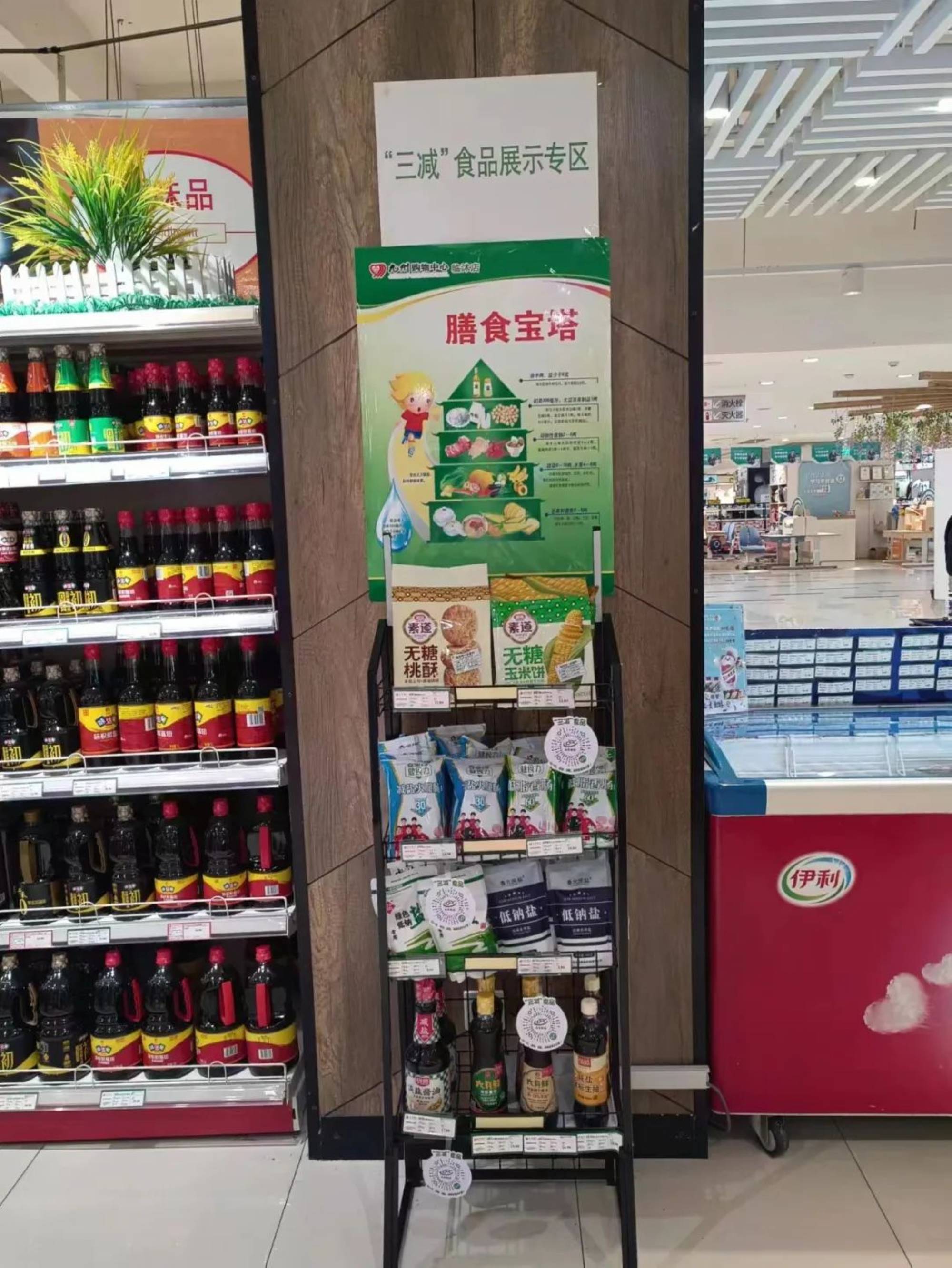 九州商業(yè)大廈臨沭店超市通過張貼宣傳畫、提示貼,發(fā)放宣傳單頁等方式向顧客進(jìn)行宣傳,引導(dǎo)顧客選擇鹽、糖、油含量低的商品,顧客掃描端架張貼的二維碼即可了解“三減”食品及相關(guān)知識。