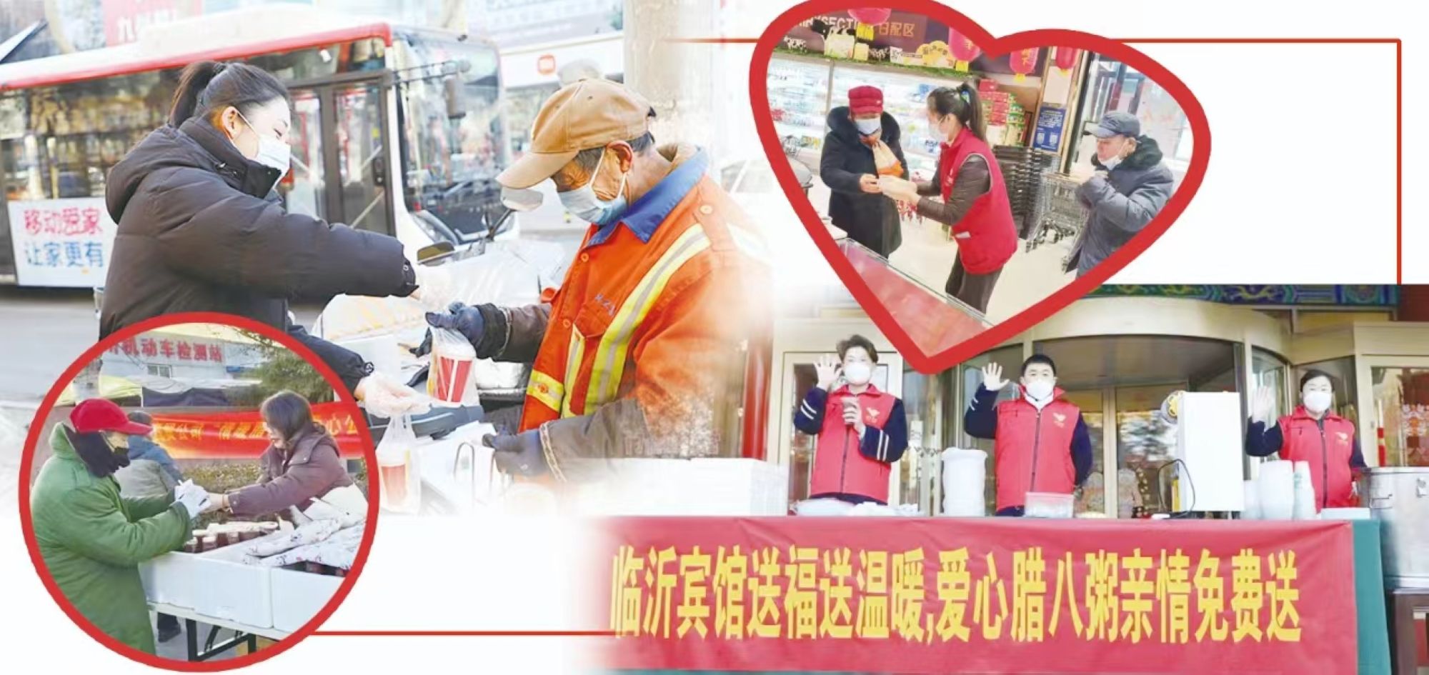 在九州超市部分門(mén)店內,工作人員熱情地為顧客遞上一碗碗熱氣騰騰的粥。汽貿公司的員工們則穿梭在街頭巷尾,將粥送到環(huán)衛工人們手中,其中小于在送完粥后,臉上洋溢著(zhù)幸福的笑容,感慨道:“看到他們喝粥時(shí)臉上綻放的笑容,我這心里滿(mǎn)是溫暖,感覺(jué)一早上的忙碌都值了!痹诰胖菝朗硤@門(mén)口、臨沂賓館開(kāi)發(fā)區店,員工將臘八粥裝好打包,送到周邊執勤特警、環(huán)衛工人、過(guò)往的公交車(chē)司機和市民手里。