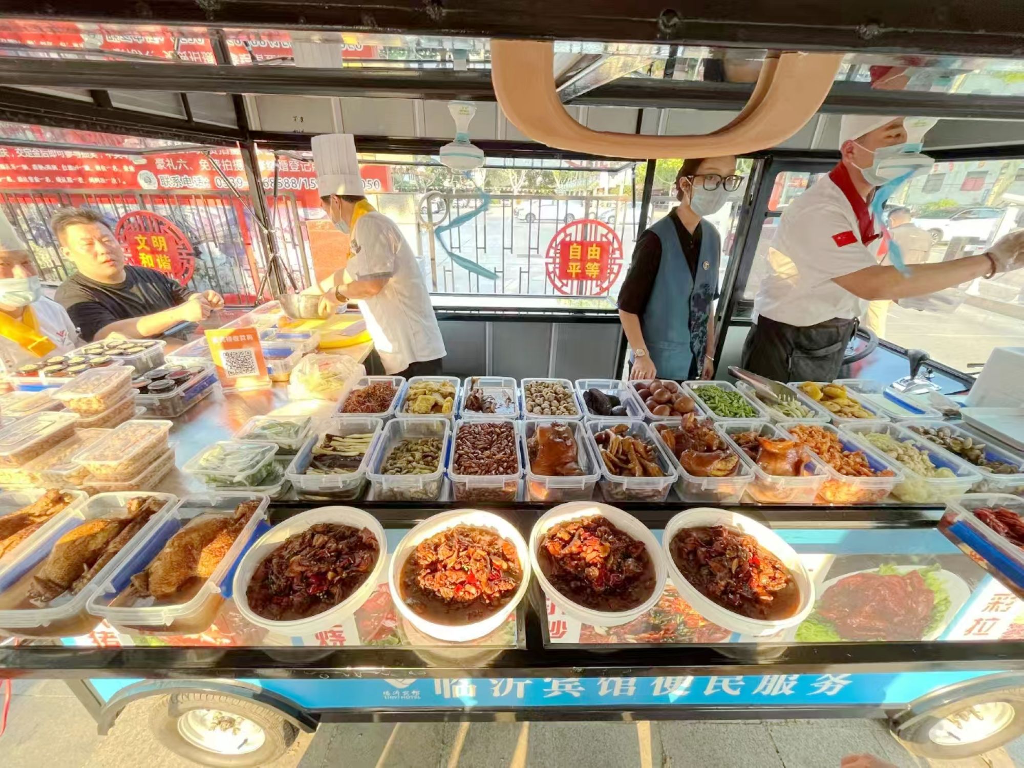 餐車(chē)采用開(kāi)放式明檔設計,顧客能直觀(guān)看到新鮮菜品陳列。所有產(chǎn)品均由沂蒙路店貴賓樓廚房當日現制,從食材選購到烹飪出品,嚴格食品安全、出品品質(zhì)管理,確保食材新鮮、健康、美味。所售菜品價(jià)格實(shí)惠、購買(mǎi)便捷,真正實(shí)現“星級品質(zhì),親民價(jià)格”。銷(xiāo)售過(guò)程中,廚房團隊通過(guò)實(shí)時(shí)監測銷(xiāo)售數據,靈活調整補貨策略,保證菜品供應充足,最大程度滿(mǎn)足顧客購買(mǎi)需求。
